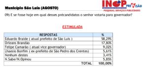 Comparativo dos números de pesquisas feitas em São Luís pelo Instituto Nacional de Opinião Pública (Inop Previsão), nos meses de junho e agosto, mostra crescimento da pré-candidatura de Orleans Brandão (MDB) ao governo do Estado e queda do percentual do pré-candidato Eduardo Braide (PSD). Chama atenção que o declínio do prefeito de São Luís ocorre justamente após anúncio da aproximação dele com o grupo de dinistas de extrema esquerda comunista.