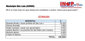 No âmbito do estado, o levantamento do Inop Previsão também já aponta empate técnico entre Eduardo Braide e Orleans Brandão. Em cenário estimulado, Braide aparece com 33.89% enquanto Orleans soma 30.17% da preferência do eleitorado. Em terceiro lugar, está o ex-prefeito de São Pedro dos Crentes, Lahesio Bonfim (Novo), com 15.23%; e em quarto aparece Felipe Camarão, com 9.33%.